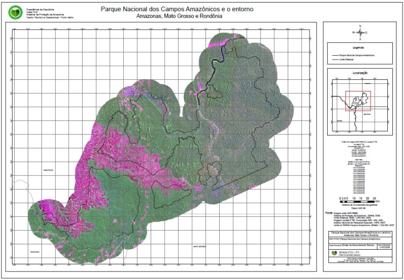 Carta Imagem do Parque Nacional dos Campos Amazônicos e o entorno, Amazonas, Mato Grosso e Rondônia. Elaborado a partir da Fusão de Imagens SAR R99-B e Landsat 5 TM, ano 2006 e 2007.
