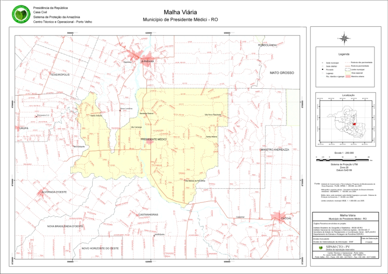 A Malha Viária Digital do Estado de Rondônia representa, atualmente, a informação mais atualizada sobre as vias de acesso do Estado. O projeto foi desenvolvido em parceria pelo Sistema de Proteção da Amazônia - SIPAM, Instituto Brasileiro de Geografia e Estatística - IBGE/EU/RO, Instituto Nacional de Colonização e Reforma Agrária - INCRA/SR/17, Secretaria de Estado do Planejamento e Coordenação Geral - SEPLAN/RO e Departamento de Estradas de Rodagem de Rondônia – DER/RO. O levantamento da malha viária contemplou, de forma precisa, o traçado representativo cartográfico e a identificação das estradas. Os trechos pavimentados e não pavimentados foram separados. O trabalho compreendeu também a obtenção e sistematização de informações acerca de pontos e/ou locais de referência, tais como postos de combustíveis, lanchonetes, escolas, postos de saúde, povoados, lugarejos, pontes sobre alguns rios e igarapés. Neste caso, para os pontos levantados optou-se pelo uso da denominação conhecida em campo. A utilização da Malha Viária Digital do Estado de Rondônia favorece os trabalhos de georreferenciamento de imagens por satélite e pode auxiliar futuros trabalhos de correção na representação cartográfica de limites municipais. O banco de dados resultante do projeto se constitui num importante suporte para o planejamento e realizações de operações de campo. O levantamento executado teve início no ano de 2004. Obviamente, considerando o intervalo entre os anos de início e conclusão dos trabalhos, certamente devem existir novos elementos que não estão representados nesta versão. Deste modo, fica a cargo das Prefeituras Municipais e demais órgãos parceiros informar eventuais atualizações a serem feitas, principalmente no tocante a estradas construídas ou pavimentadas recentemente, bem como em relação à existência de estradas não levantadas. Foram levantados alguns trechos da malha viária urbana, porém não foi o objetivo principal deste projeto. Portanto, é importante esclarecer que os trabalhos de campo concentraram-se na zona rural dos municípios.