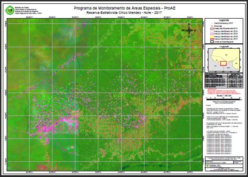 Carta Imagem da Reserva Extrativista Chico Mendes, referente ao avanço do desmatamento de 2017, elaborada com base na análise do desmatamento dos anos de 2013 a 2016. Análise feita por técnicos do SIPAM, com base nas imagens do satélite Landsat 8, sensor OLI. Esta carta faz parte do Programa de Monitoramento de Áreas Especiais (PROAE 2016) do Estado de Rondônia. Foram ainda utilizado dados de parceiros, conforme detalhamento abaixo nas INFORMAÇÕES DE QUALIDADE DE DADOS.