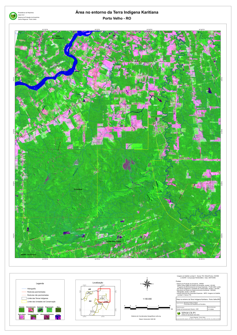 Carta imagem da área no entorno da Terras Indígena Karitiana, localizada no Estado de Rondônia, elaboradas com dados vetoriais armazenados na base SIPAM e imagem do satélite Landsat 5.