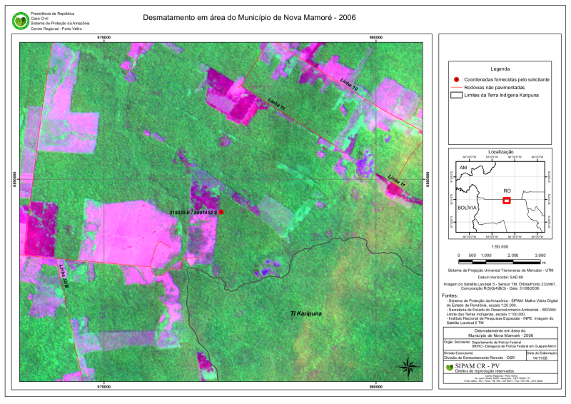 Cartas imagem demonstrando o desmatamento ocorrido em determinada área do Município de Nova Mamoré, elaboradas com dados fornecidos por Auto de Infração do IBAMA e imagens do satélite Landsat 5.
