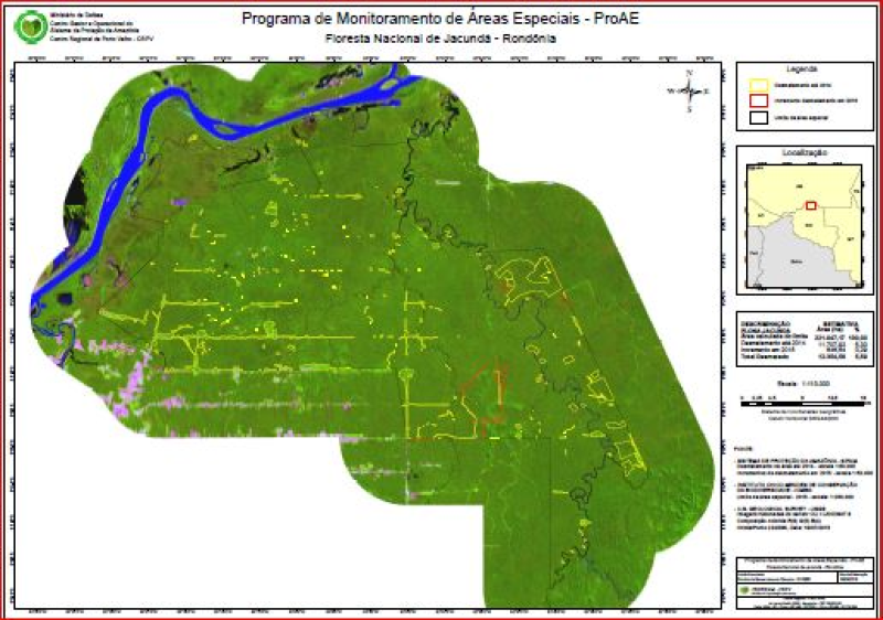 Carta Imagem da Floresta Nacional de JACUNDÁ - RO, referente ao avanço do desmatamento de 2015, elaborada a partir do desmatamento ocorrido dentro da unidade até 2014 (PROAE), construído na escala de 1:50.000, com base nas Imagens do Satélite LANDSAT 8, Sensor OLI ano 2015. Foram ainda, utilizados , além da malha viária do estado de Rondônia (dados do SIPAM) e outros dados de desmatamentos do Proae de anos anteriores. conforme descrição detalhadas no (BOX) INFORMAÇÕES DE QUALIDADE DOS DADOS.