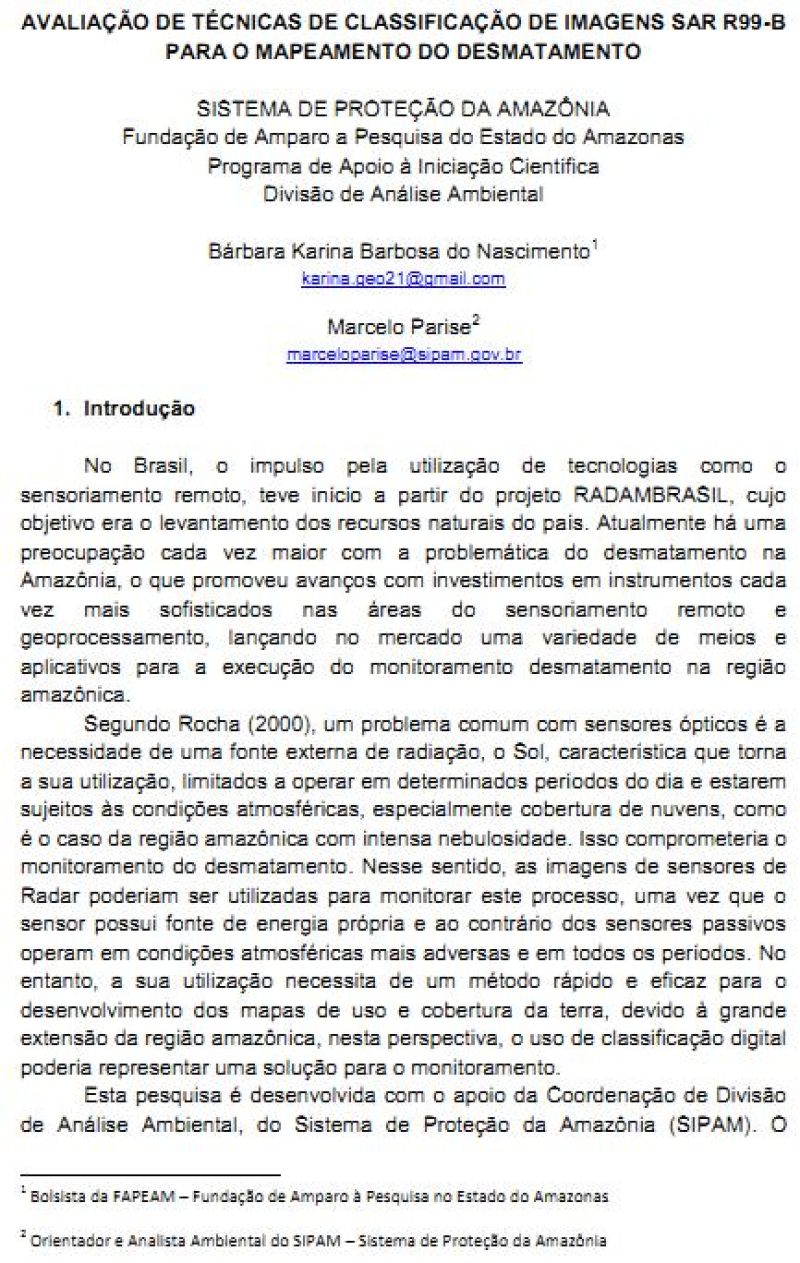 O objetivo geral é analisar o potencial de imagens do sensor SAR/SIPAM para o monitoramento de desmatamento no Amazonas, tendo como área teste locais com cobertura vegetal alterada, no município de Iranduba, AM. Os objetivos específicos são: definir uma área teste para desenvolver o estudo; realizar um levantamento bibliográfico sobre o processamento de imagens de RADAR na avaliação do desmatamento e comparar diferentes classificadores digitais para o mapeamento do desmatamento na área de estudo. Em função das limitações existentes no processo de classificação de imagens SAR/SIPAM este estudo visa desenvolver procedimentos que acelerem e aperfeiçoem a classificação dessas imagens. Para que futuramente a sua utilização venha a atender de maneira rápida e eficaz para o mapeamento do desmatamento na Amazônia.
